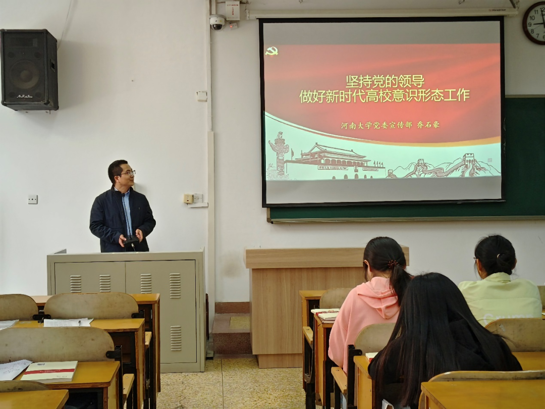 4月15日上午,2023年度入党积极分子培训班第四讲“坚持党的领导,做好新时代高校意识形态工作”主题党课开讲,主讲人为best365足球官网党委宣传部副部长乔石豪老师。