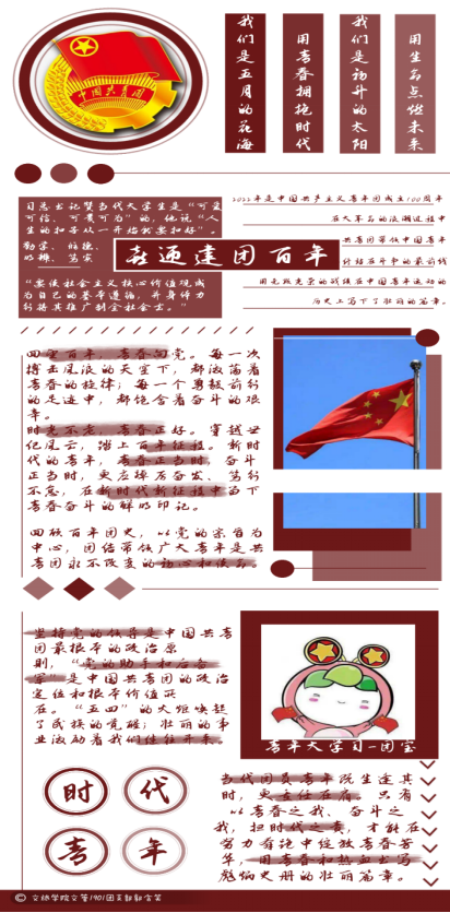 文化产业管理1901团支部的郭含笑做了一页手账,正如她所说:在制作的过程中,我又回顾了共青团的历史,并再次感叹我辈生逢其时,又责任在肩。我志愿加入中国共产主义青年团,坚决拥护中国共产党的领导,遵守团的章程……,从成为共青团员,进入中国共产主义青年团的那一天起,我就知道了,中国共产主义青年团是中国共产领导的先进青年的群众组织,是广大青年在实践中学习中国特色社会主义和共产主义的公司,是中国共产党的助手和后备军。作为共青团员,我们应该不断提高自己的能力,提高道德品质,勇于为梦想奋斗不忘初心,同时也要积极向团组织靠拢。为祖国发展奉献青春力量!