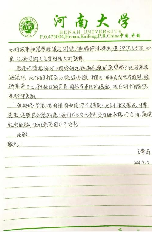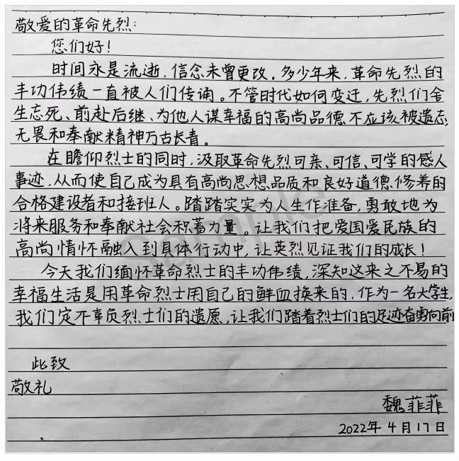 旅游管理2102团支部魏菲菲亲手写了一封寄给革命先烈的书信,信中说道:时间虽流逝,信念未曾改。我们在瞻仰烈士的同时,汲取革命先烈可亲、可信、可学的感人事迹,从而使自己成为具有高尚思想道德和良好修养的新一代大学青年。