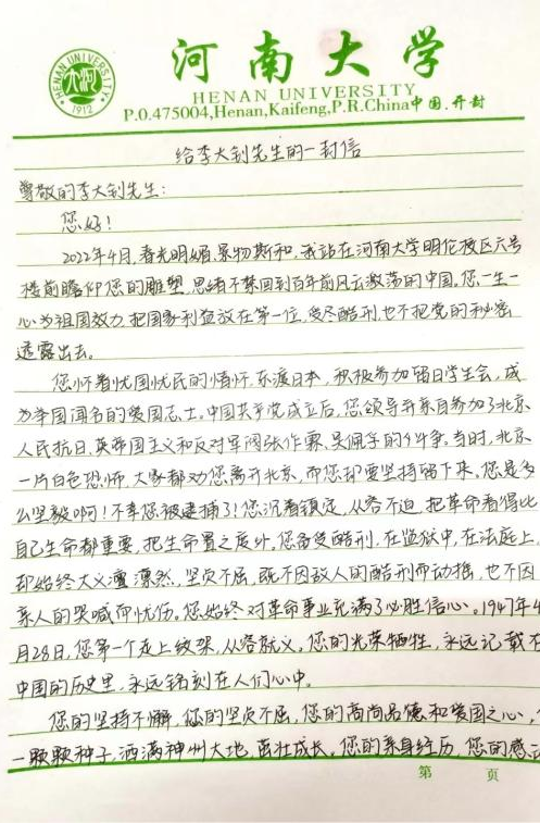 旅游管理2001团支部王梦苒在“穿越时空的书信”活动中,手写了一封致李大钊先生的信,信中表达了对李大钊先生的崇敬与赞扬。“星星之火,可以燎原”,中华民族最终屹立于世界民族之林,而这盛世也如李大钊先生所愿,幸福,安康!