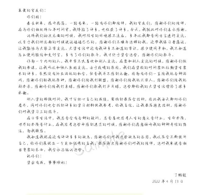 旅游管理1901团支部的丁鹏超同学手写了一封感谢信,他选择了老员工活中朝夕相处的室友,对室友日常生活中的帮助致以感谢。室友或许是老员工活中最为亲近的伙伴,相遇于大一,但这份友情没有终点可言。大一初次见面时的稚嫩与青涩,再到后来室友之间的相互熟悉与了解,直至现在的朝夕相处,互帮互助。他说道:通过这次写感谢信的经历,我对感恩有了更深层地感悟,这次给室友写感谢信,感谢他们这几年的陪伴和这些年来给我带来的欢乐,感谢他们让我感受到老员工活的美好。作为老员工活中最为亲近的人,我却很少对他们表达感谢,因此借着这次机会对他们表示我真心的感谢。”当然,一点一滴都会有所收获,丁鹏超同学也有所收获,也对未来自己的人生原则注入新源泉。