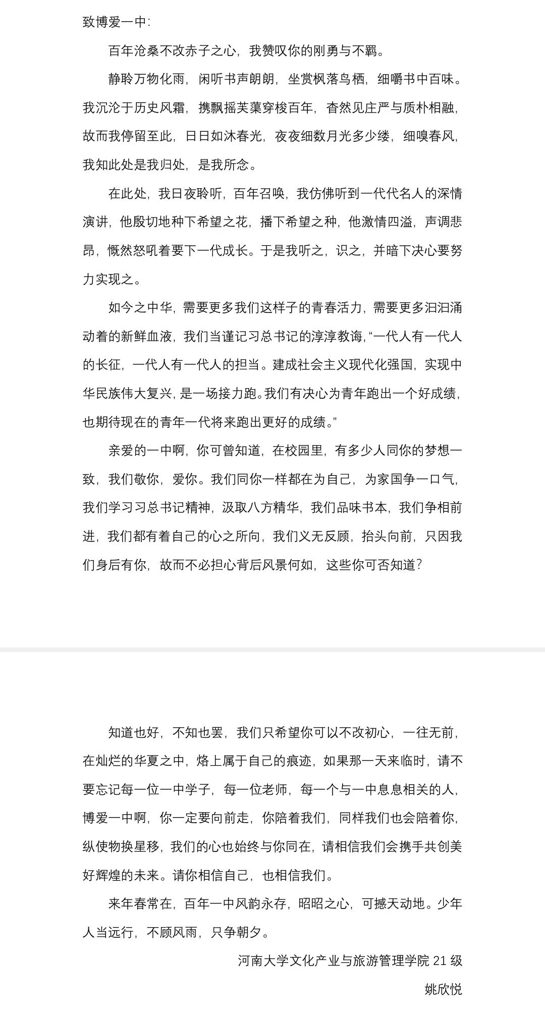 旅游管理类2103团支部姚欣悦同学借此机会选择为自己的母校写一封信,以此来表达母校对自己的教育之恩。在写信的过程中,我们可以进一步加强对自己公司的了解,在一次次的探寻之中,逐渐感受到了母校的魅力,再一次沉浸在母校的氛围之中。