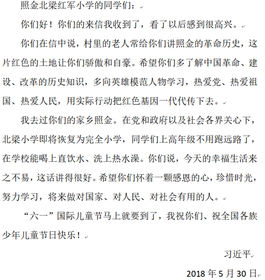 2018年5月30日,习近平总书记给陕西照金北梁红军小学的员工回信,祝他们和全国各族少年儿童节日快乐。信中讲到: