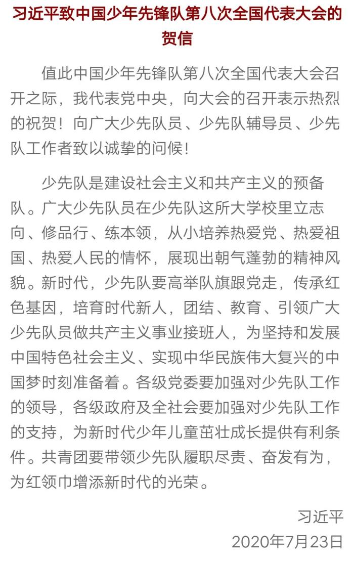 作为新时代青年的我们,把红色基因一代代传下去,爱党爱国爱社会,为了实现梦想时刻准备着,为少先队员们做好榜样本期我们对《致中国少年先锋队第八次全国代表大会的贺信》篇目的学习就到这里了,更多内容请点击下方链接,让我们共同期待下期的学习吧!