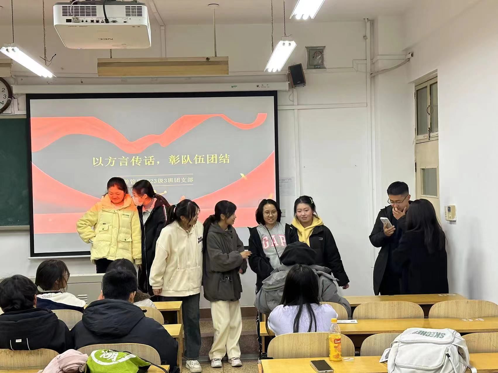 在“以方言传话,彰队伍团结”活动中,旅游管理类2301团支部和旅游管理类2303团支部积极开展家乡话传话学习活动,学习家乡话中蕴含的爱国主义精神。旅游管理类2303团支部赵宁君华表示:“在活动过程中同学们积极参与,用最特色的家乡话进行比赛,此次团日活动让参与的同学们意识到了队伍团结的重要性,更增强了团支部的凝聚力,促进了团支部队伍团结。”