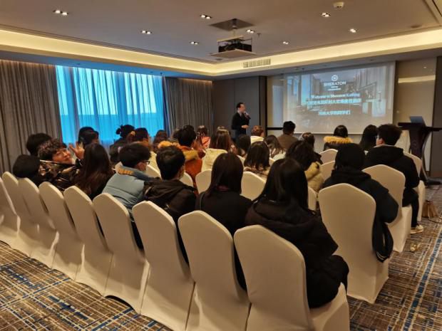 喜来登酒店人力资源部学习与发展经理周垒热情接待了到访的师生。在周经理的带领下员工对酒店进行了参观。接着,在酒店三楼会议厅,周经理从万豪国际酒店管理集团的发展开始讲起,整体介绍了万豪集团,万豪酒店集团及集团文化理念。同时,结合旅游行业发展史记,周经理还针对新冠疫情以后国内国际旅游新态势,强调旅游业在未来发展中的特殊地位和作用,他认为旅游业是值得投资与奉献的行业,鼓励同学们努力学习专业知识,坚持行业发展方向。周经理还对喜来登酒店进行了大致的介绍。喜来登酒店是国际知名连锁酒店品牌,首家酒店于1937年建成并投入使用。万豪集团的酒店形态多样,商业旅馆、大型度假村都有。喜来登品牌于1985年进入中国市场,成为第一家进入中国的国际连锁酒店品牌。喜来登酒店始终以“打开机遇之门”为目的;以“成为全球对受青睐的旅宿业公司”为愿景;始终践行“以人为本、追求卓越、拥抱变革、诚实正直、服务全球”的核心价值观,不断深耕发展,才成就了今天的规模与实力。同时周经理也对同学们感兴趣的实习话题展开了阐释,简要介绍了喜来登酒店的用人标准及福利待遇。在结尾的互动环节,周经理一一回复了同学们的疑问与困惑,使员工对于喜来登酒店及专业实践有了进一步的认知与感悟。
