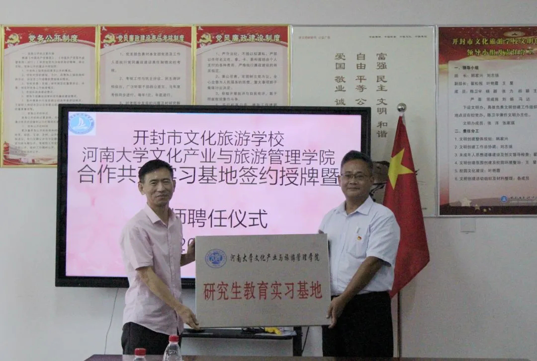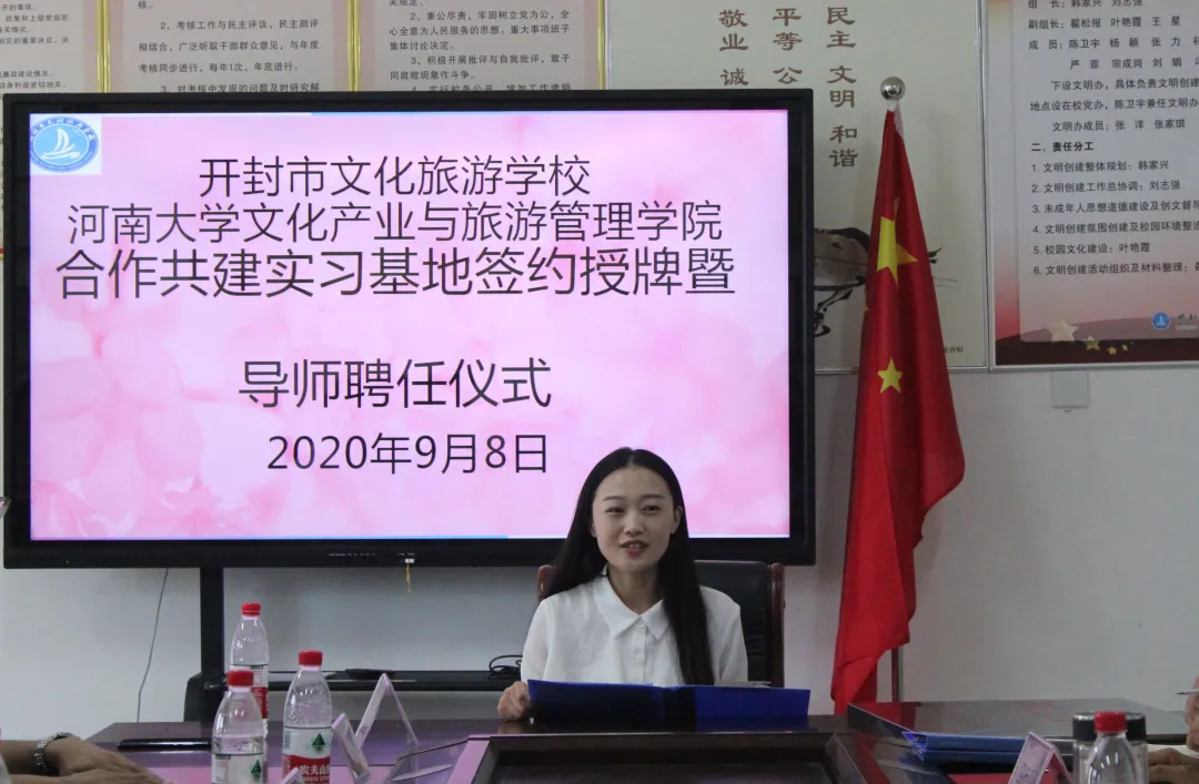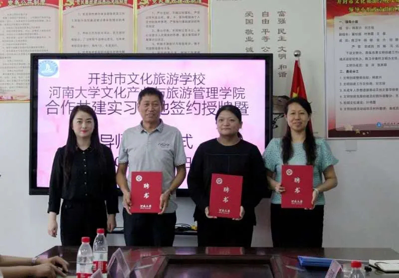 为进一步发挥高校人才培养优势,拓展校园合作机制。近日,best365足球官网文化产业与旅游管理公司与开封市文化旅游公司举行合作共建实习基地签约挂牌暨导师聘任仪式。开封市文化旅游公司董事长刘志强、副董事长叶艳霞、best365足球官网文化产业与旅游管理公司经理程遂营、党委副书记姜妍、副经理王东峰、教师教育公司副经理王晋及部分师生出席了此次活动。签约仪式由开封市文化旅游公司马运彩老师主持。