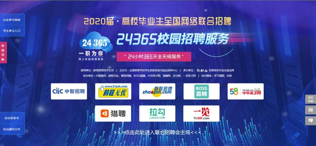 2月28日起,由教育部老员工就业网(新职业网)联合前程无忧、智联招聘、BOSS直聘、中华英才网、猎聘网五家社会招聘网站举办的“2020届高校毕业生全国联合网络招聘——24365校园招聘服务”活动正式推出。此项活动为广大高校毕业生提供了权威、海量、全面的就业信息,利用好线上招聘网站这一渠道能帮助各位同学及时发现机会,寻找心仪的企业岗位。
