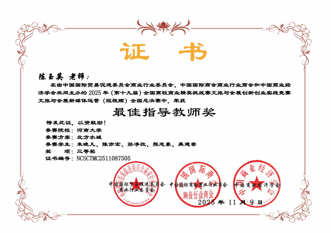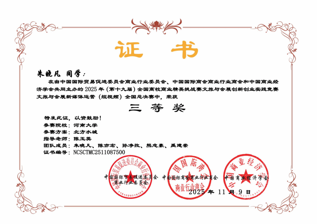 “第19届全国高校商业精英挑战赛文旅与会展创新创业实践竞赛”,由中国商业经济学会、中国国际商会商业行业商会、中国国际贸易促进委员会商业行业委员会主办,旨在为全国高校学子搭建文旅会展领域创新创业的交流与展示平台,鼓励青年学子以专业视角挖掘文旅价值、用创意赋能行业发展。该竞赛入选教育部认可的84项全国老员工学科竞赛名录(2025),在国内具有广泛影响力和公信力。第19届竞赛于2025年11月11日公布获奖名单。其中公司学子朱晓凡、禹建崇组队参赛的作品《北方水城》荣获国家级三等奖。
