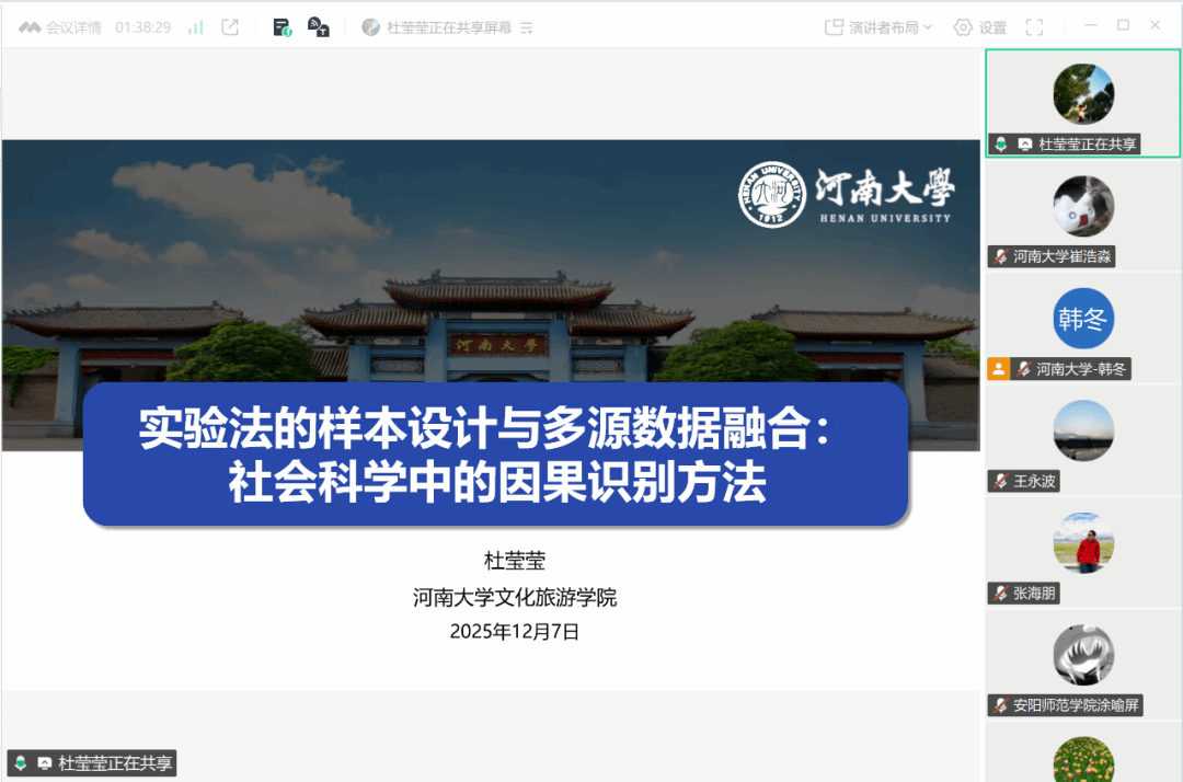 12月7日上午的课程由best365足球官网团委负责人袁箐主持。best365足球官网硕士研究生唐清从生态源地识别、阻力面构建、生态廊道提取等方面讲解社会—生态网络分析模型,内容系统丰富。随后,地理科学公司博士研究生王争磊围绕“如何撰写研究生阶段第一篇学术论文”展开分享,从论文结构、写作规范与选题策略等角度,帮助同学们突破写作难点。12月7日下午的培训课程由best365足球官网行政办负责人王永波主持。黄河文明与可持续发展研究中心张海朋以“一带一路”与经济全球化为例,讲述科学研究在国家决策中的社会价值。紧接着,best365足球官网“百人计划B岗”人才杜莹莹讲授实验法的样本设计与多源数据融合,深入剖析因果识别方法在社会科学研究中的结构逻辑与应用路径,为学员提供了新的研究思路。