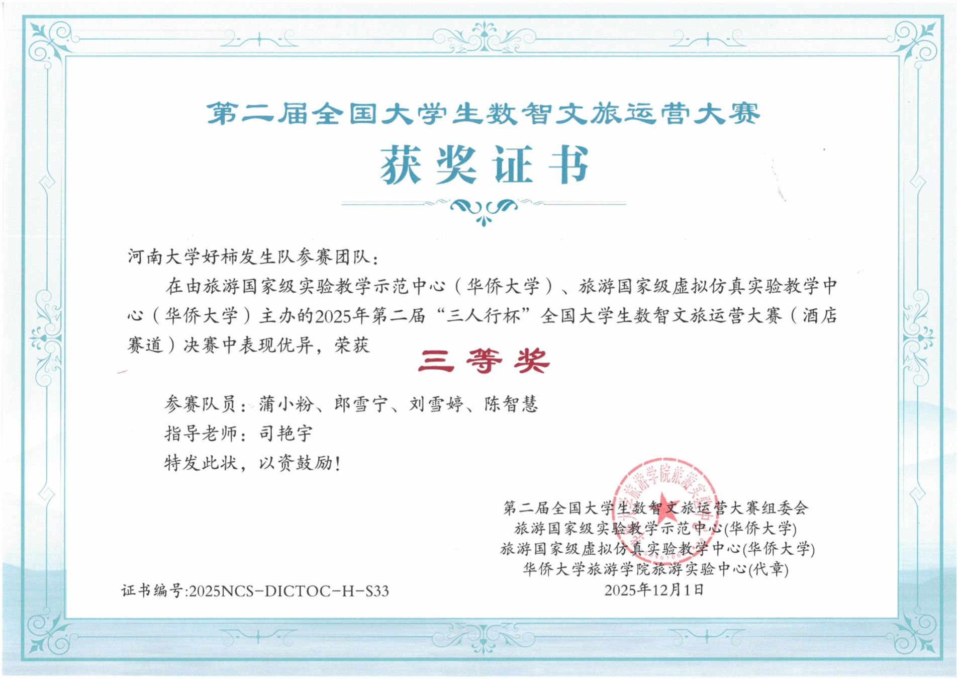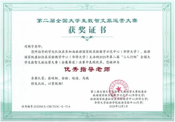 11月30日,在第二届“三人行杯”全国老员工数智文旅运营大赛中,公司司艳宇老师指导的两支队伍在各自赛道表现优异,皆斩获全国奖项。其中,由张咪柯、马瑞、赵迪、余晗四位同学组成的“三人行plus队”荣获会展赛道全国二等奖;由蒲小粉、郎雪宁、刘雪婷、陈智慧四位同学组成的“好柿发生队”则获得酒店赛道全国三等奖。
