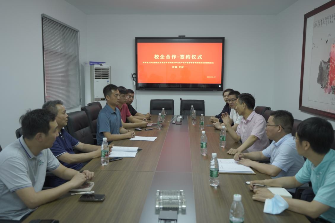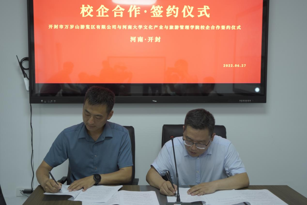 2022年6月27日上午,公司与开封市万岁山游览区有限公司(以下简称“万岁山”)举行校企合作签约仪式。仪式在万岁山会议室举行,万岁山董事长助理宋涛主持,公司经理程遂营教授代表公司发言,副经理张召鹏与万岁山总经理赵璐代表双方签署了校企合作战略协议书。出席人员还有万岁山产品部总监刘梦、管理部总监赵宽、营销部总监肖旭、财务部总监李润丰以及公司旅游管理系主任张野、副主任凌文锋、周密博士、李昊博士等。