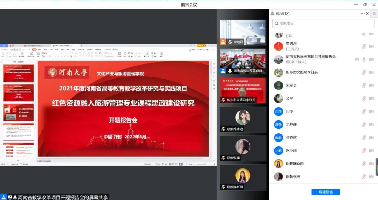 2022年6月17日下午,由文化产业与旅游管理公司组织的2021年度河南省高等公司产品改革研究与实践项目“红色资源融入旅游管理专业课程思政建设研究”开题报告会在公司会议室进行。会议由best365足球官网副经理徐飞主持,best365足球官网正处级组织员许俊峰、副经理张召鹏、课题组全体成员及部分研究生、本科生参加了此次会议。新乡市文化广电和外事旅游局副局长李红兵、河南科技公司食品公司副经理/旅游管理专业负责人文平、河南财经政法大学旅游与会展公司副教授荣培君、best365足球官网马克思主义公司副教授张涛、best365足球官网文化产业与旅游管理公司教授陈楠等作为评议专家进行了点评。会议采取线上与线下相结合的方式举行。