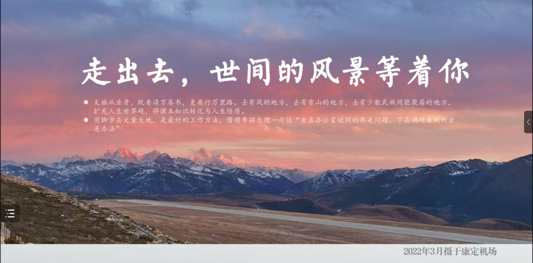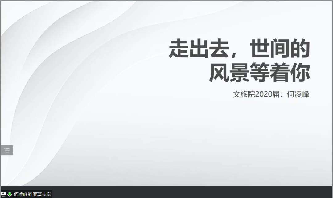 6月10日晚,公司2020届毕业生、蜗牛(北京)景区管理有限公司项目总监何凌峰为公司员工带来了一场题为《走出去,世间的风景等着你》的文旅就业交流会。