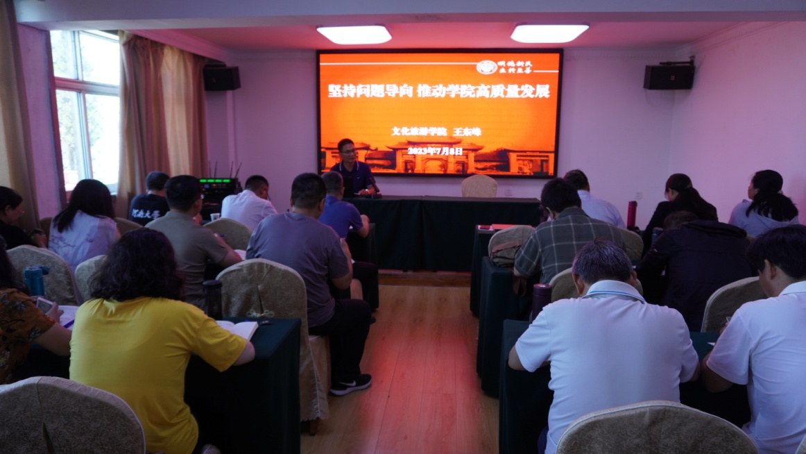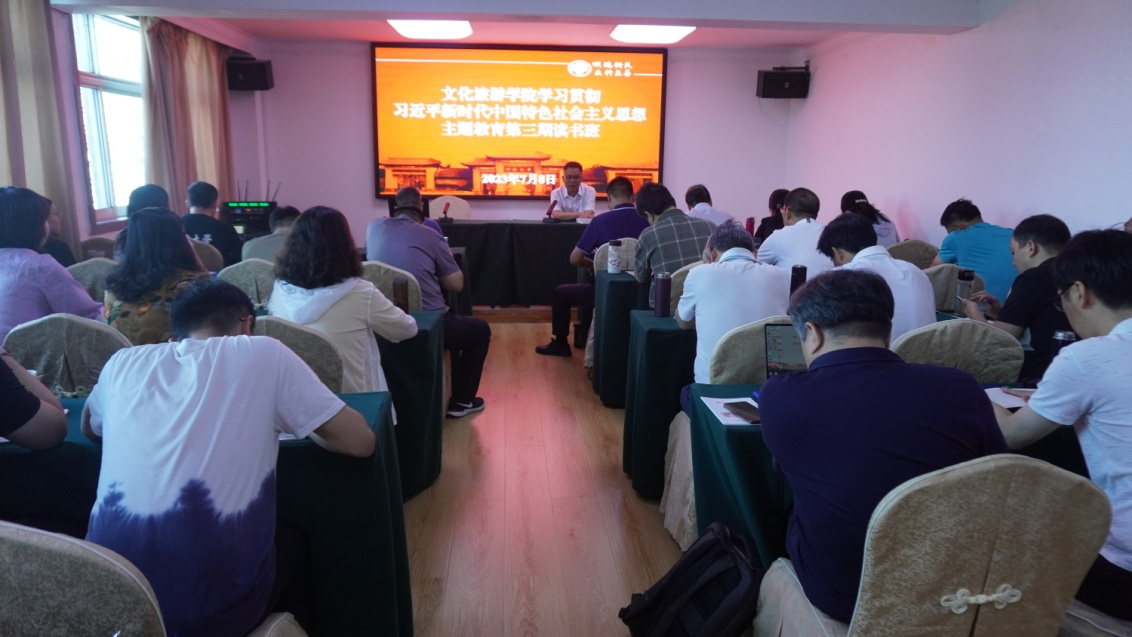 扎实开展主题教育,在“言”上有收获。读书班上,公司举行了贯彻落实2023年河南省文旅文创大会会议精神交流研讨会。副经理张召鹏、文化产业管理系主任刘涛、酒店管理系肖建勇结合大会召开背景、大会亮点以及省委书记楼阳生的重要讲话精神与大家进行了分享。与会人员以主题教育和文旅文创大会召开为背景,结合公司工作实际,对公司发展中存在的问题进行了充分讨论,积极建言献策。