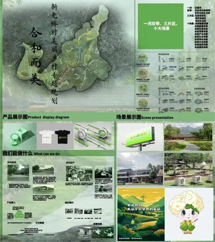 本次大赛公司团队以河南省信阳市光山县白雀园镇新光桥村为背景,进行实地调研,以现有资源为基础,市场需求为导向,以建设美丽乡村为目标,以旅游为引,通过基础性改造、特色化开发、个性化塑造、差异化发展、人居环境美化等多方面推动新光桥村发展增量提质,提出“一河双带,三片区十场景”的规划思路,打造“合和而美”的美丽乡村。