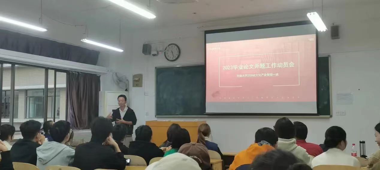 本次会议由文化产业管理系教师和员工参与,会议上系主任刘涛老师对本次动员会以及毕业论文的重要性进行强调,张召鹏老师、王淳老师、李涵闻老师、王四鹏老师、孙浬阳老师分别介绍自身研究方向,并给予同学们相应的毕业论文写作技巧和思路。