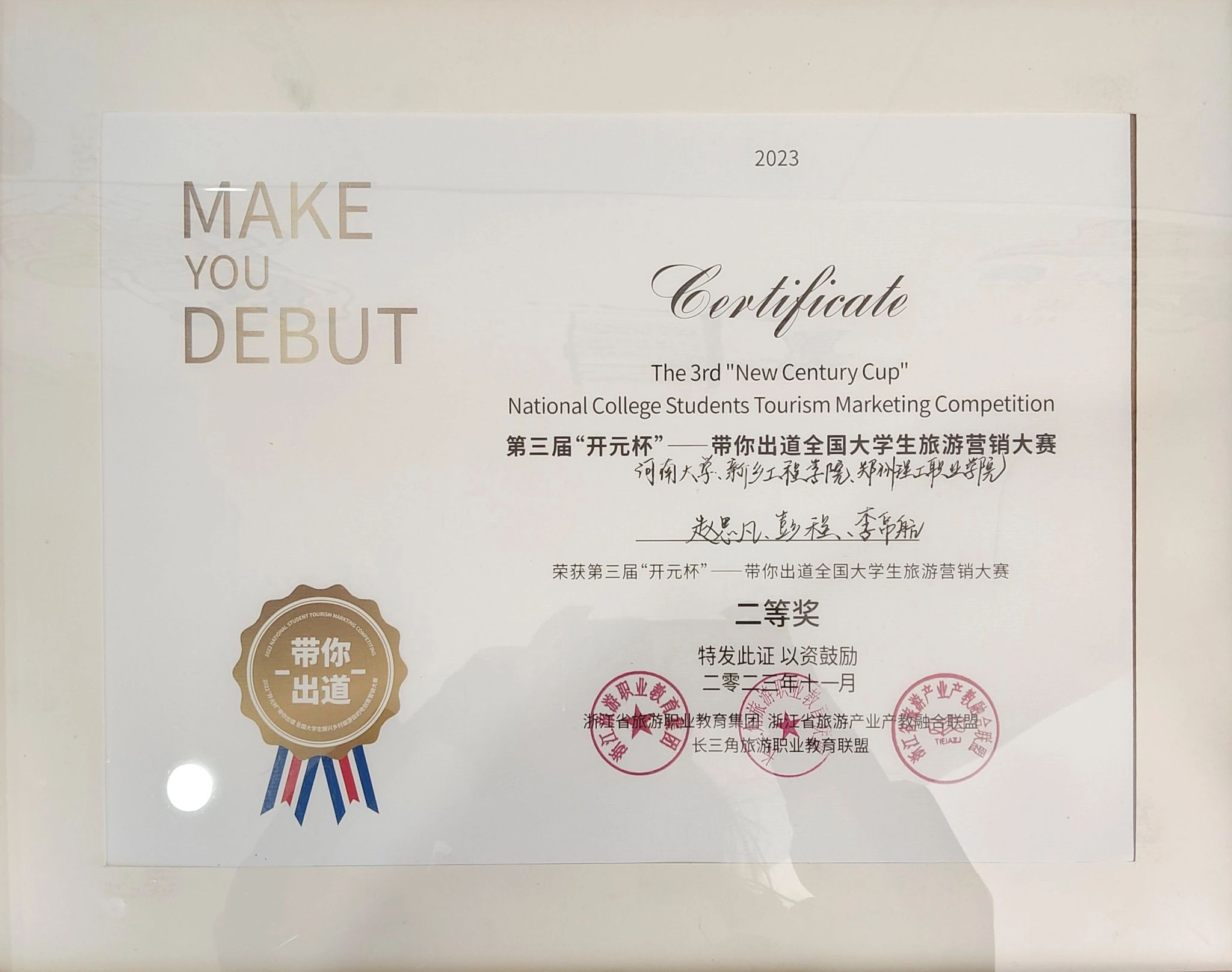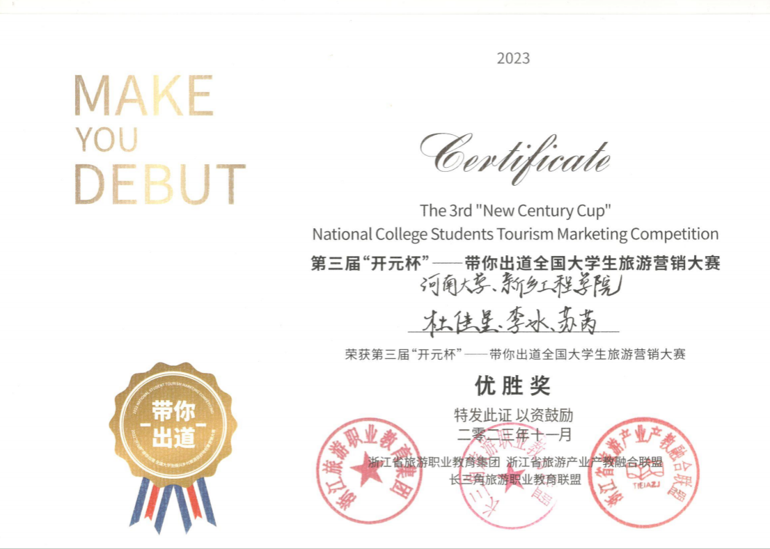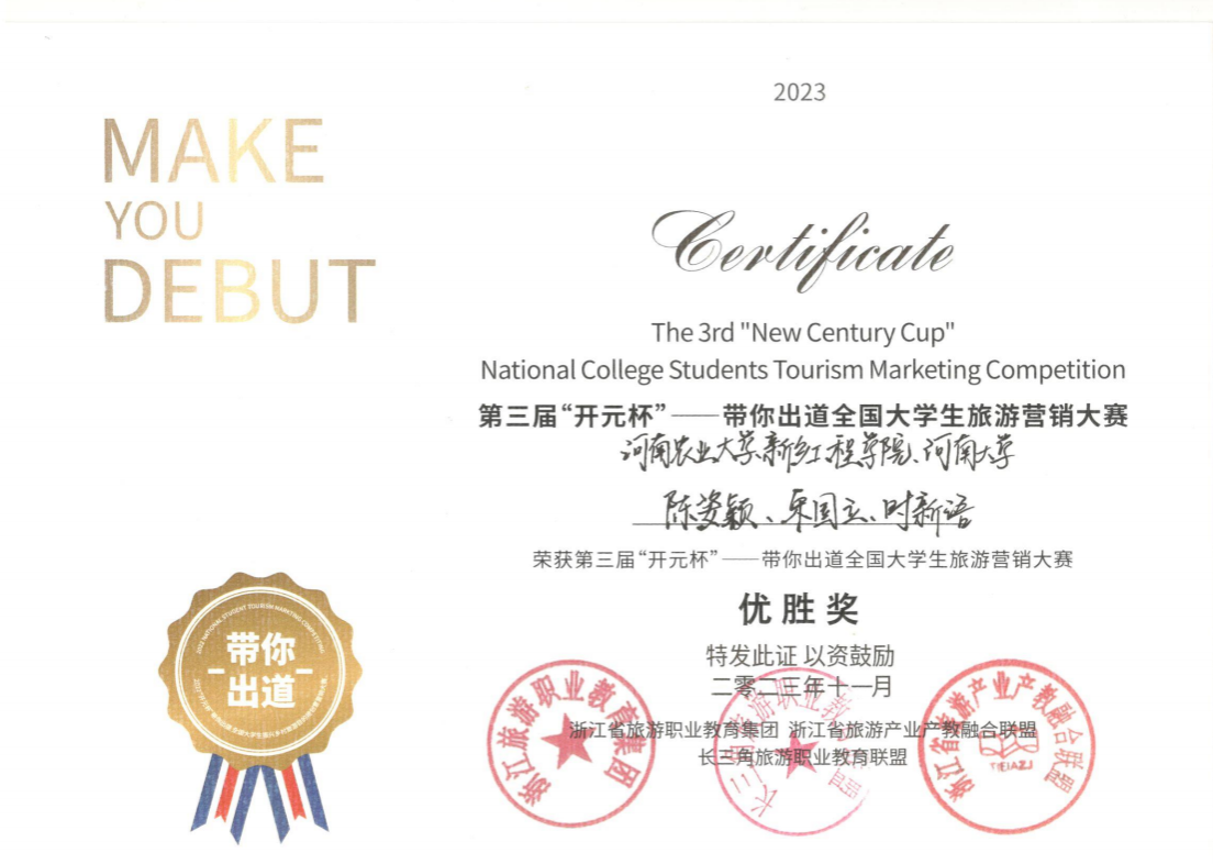 11月3日下午,由长三角旅游职业教育联盟、浙江旅游职业教育集团、浙江省旅游产业产教融合联盟、开元旅业集团等主办,开元森泊承办的第三届“开元杯”带你出道全国老员工旅游营销大赛在莫干山开元森泊度假乐园成功举办。公司旅游管理专业员工彭程、杜佳星、李冰、陈姿颖等与新乡工程公司、河南农业大学、郑州理工职业公司等院校员工联合组成的3支队伍中,2支队伍获得优胜奖,1支队伍获得决赛二等奖。其中,由公司2021级旅游管理专业员工彭程担任队长的“大禹剧场队”获得决赛二等奖,创意与规划系党支部书记宋军令老师被评为优秀指导老师。