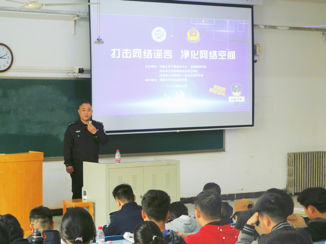 为了提升同学们的网络素养,增强对网络谣言的辨识能力,共同营造清朗的网络环境,3 月 14 日下午,由best365足球官网干部培训中心、继续教育公司、开封市公安局网络安全保卫支队以及开封市公安局城乡一体化示范区分局联合主办的,由公司承办的“打击网络谣言,净化网络空间”主题安全讲座在十号楼128教室展开。市公安局网络安全保卫支队副支队长张友成、市公安局网络安全保卫支队宋熙、及城乡一体化示范区公安局分局田冠男和康琼参加讲座,此次讲座由公司团委负责人王伟主持。