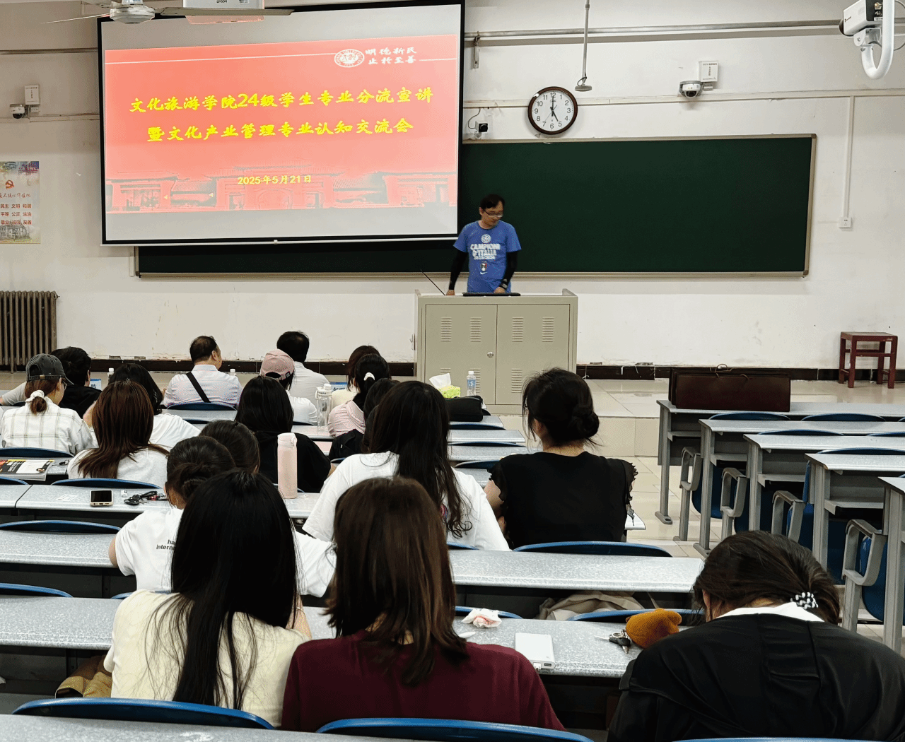 5月21日下午,为助力2024级旅游管理类专业本科生明晰专业分流方向,公司在十号教学楼129教室举行了文化产业管理专业宣讲会。宣讲会由文化产业管理系副主任李涵闻主持,张召鹏副经理、彭恒礼教授、张朝晖副教授应邀参会,部分大一员工聆听了宣讲。