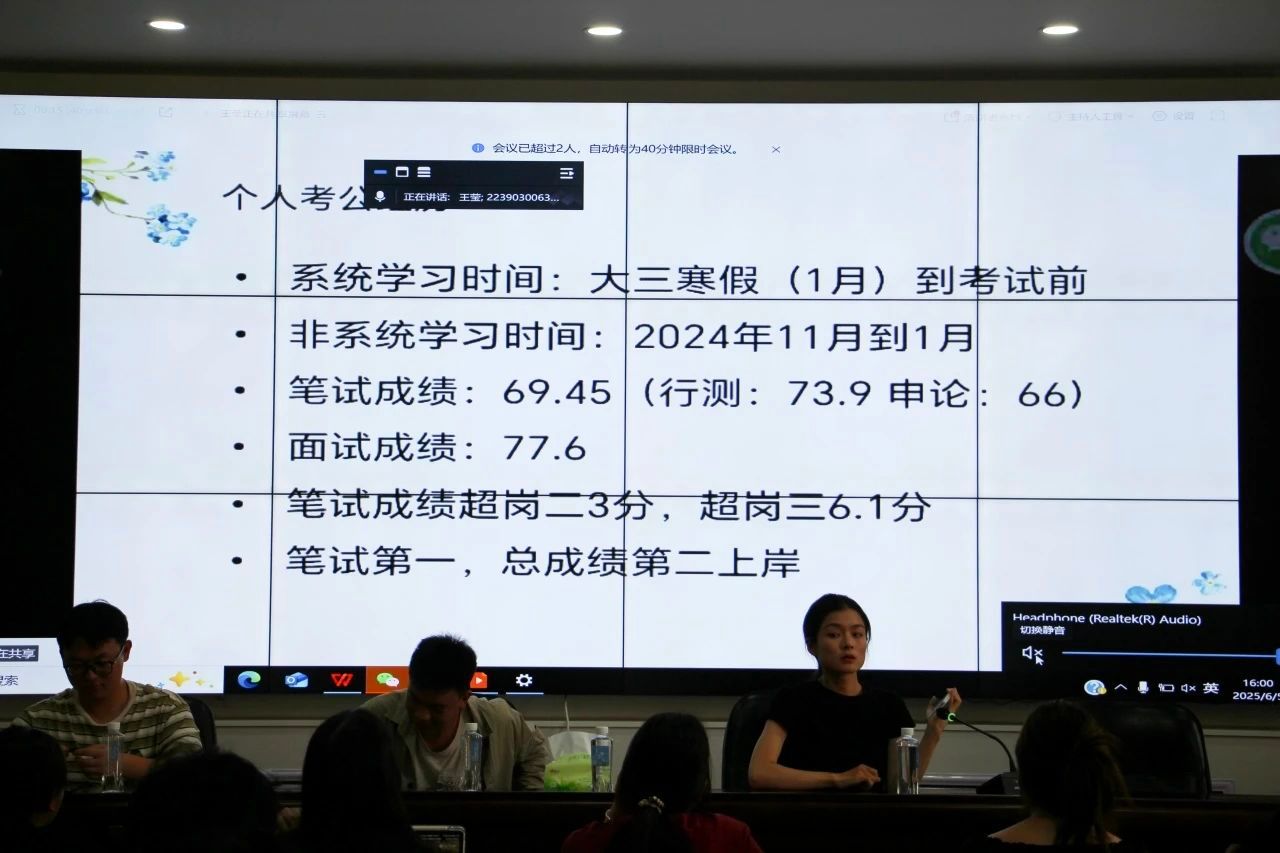 最后,范文磊学长聚焦公务员选岗与备考,详细介绍了报考流程、考试过程,同时提醒同学们要关注政府等官方公众号消息,结合工资待遇、工作地点等因素综合选择报考岗位,不断提高自身综合能力。王艳岩对范文磊的分享进行总结,为本次交流会画上了圆满的句号。