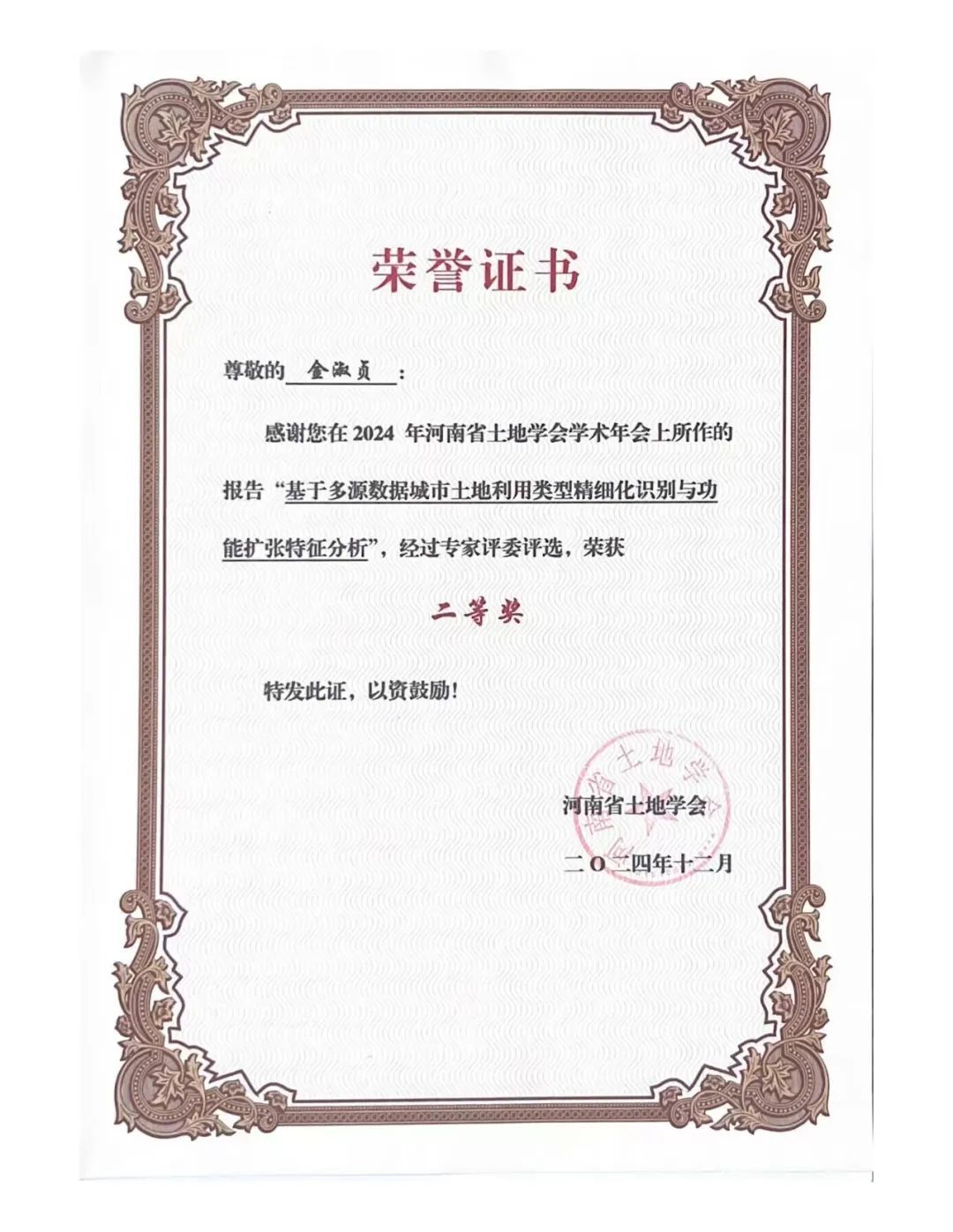 她积极参加学术会议,“流域国土空间规划与生态旅游发展”高端论坛暨研究生学术论坛会、中国地理学会春季年会暨中国地理编辑出版年会、河南省土地学会学术年会暨理事会,在每次会议分论坛都进行论文汇报,与专家交流前沿,提升自我。同时,还参与了2024《红色旅游蓝皮书》中部分内容的撰写。
