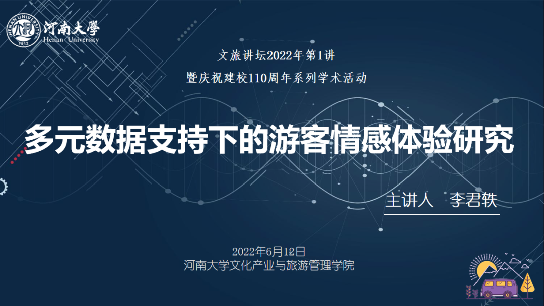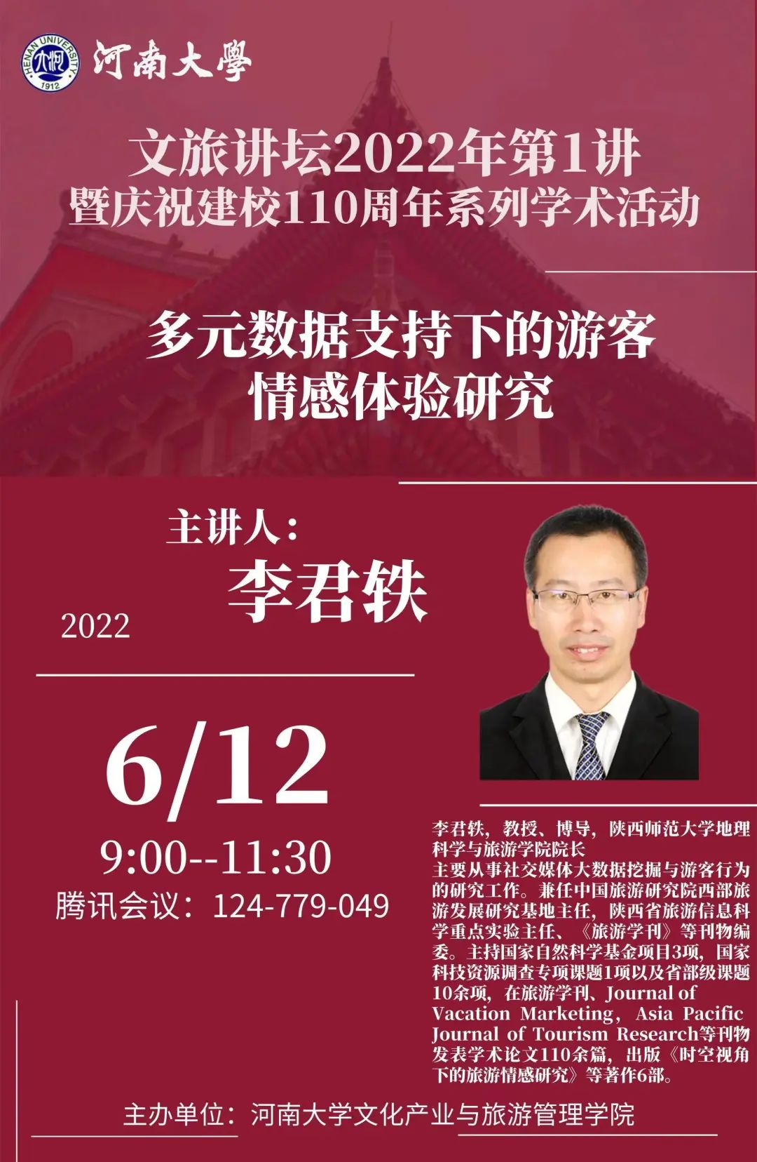 6月12日上午,best365足球官网文化产业与旅游管理公司“文旅讲坛2022年第1讲暨庆祝建校110周年系列学术活动”正式拉开帷幕。陕西师范大学地理科学与旅游公司经理、教授、博士生导师李君轶教授为公司师生做了题为《多元数据支持下的游客情感体验研究》的学术讲座。本次讲座以线上方式进行,公司教师、研究生等校内外成员共计150余人参加了此次讲座。讲座由程遂营经理主持。