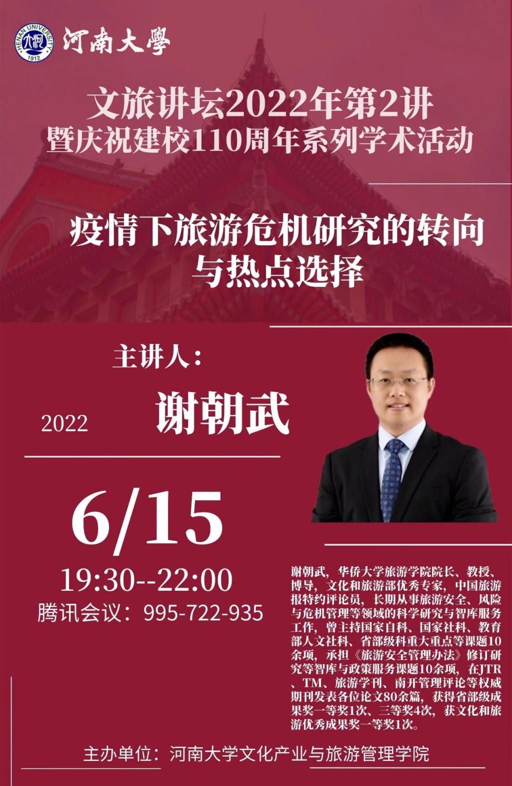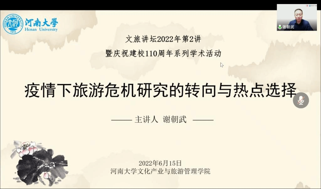 6月15日下午,华侨大学旅游公司经理、教授、博士生导师谢朝武为公司师生做了题为《疫情下旅游危机研究的转向与热点选择》的学术讲座。本次讲座以腾讯会议线上形式进行。讲座由程遂营经理主持,公司师生130余人聆听了讲座。