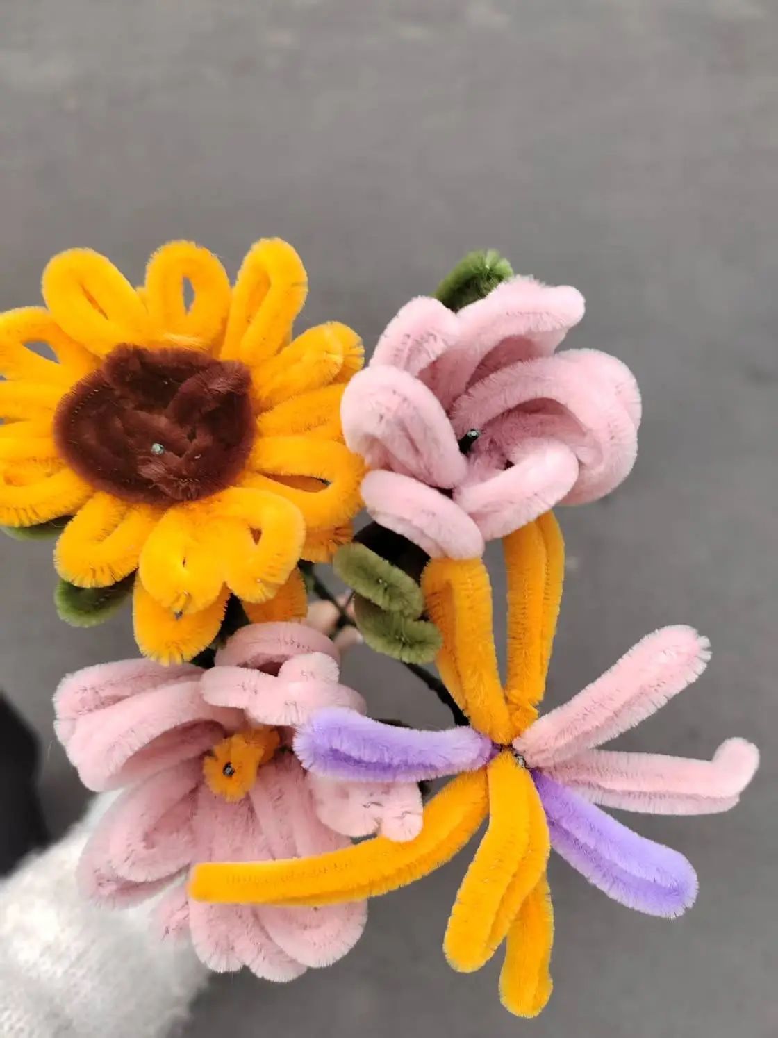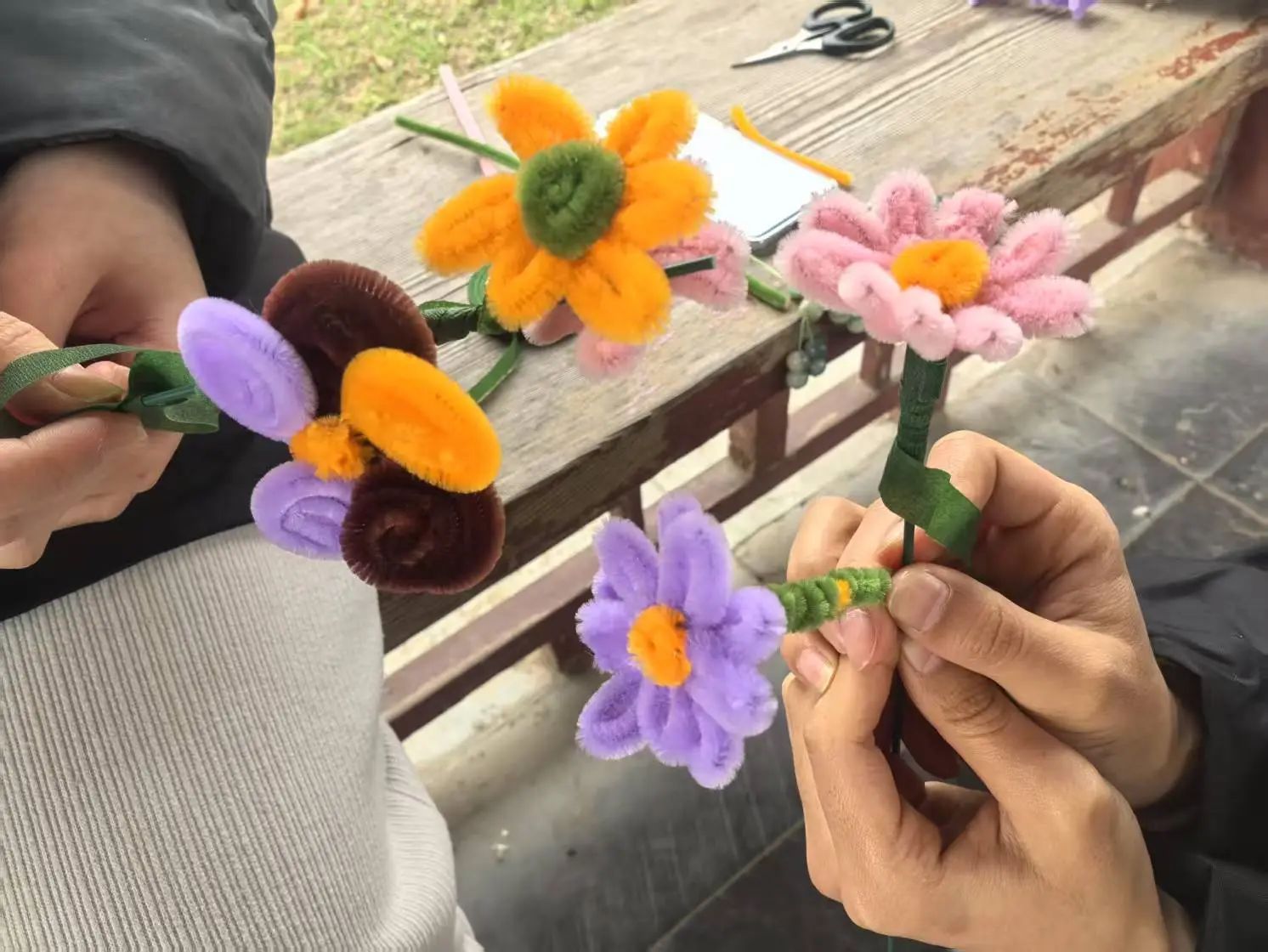 活动过程中,同学们的眼中闪烁着好奇与期待的光芒,他们精心选取了各自心仪的颜色。在指导人员细致入微的讲解与示范下,大家认真学习如何巧妙使用纤细柔软的扭扭棒,制作出栩栩如生的花束以及各种充满奇思妙想的创意作品。