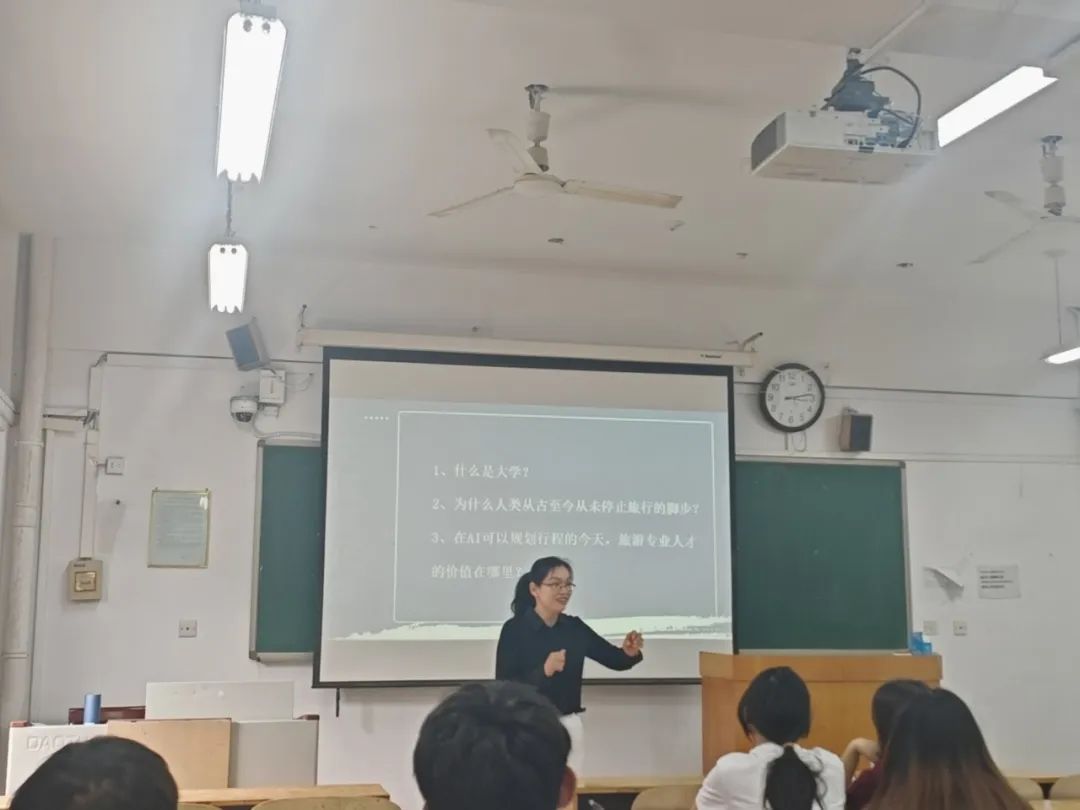 5月8日下午,“师说文旅”专业交流会2025年第3期在综合教学楼110教室开展。本期交流会以“人生逐梦正当时”为主题,邀请公司王忠丽老师主讲,与旅游管理专业的同学们共话青春梦想,探讨专业发展。活动由公司旅游管理系主任张野副教授主持,2024级辅导员郭志瑞老师和大一员工参加。