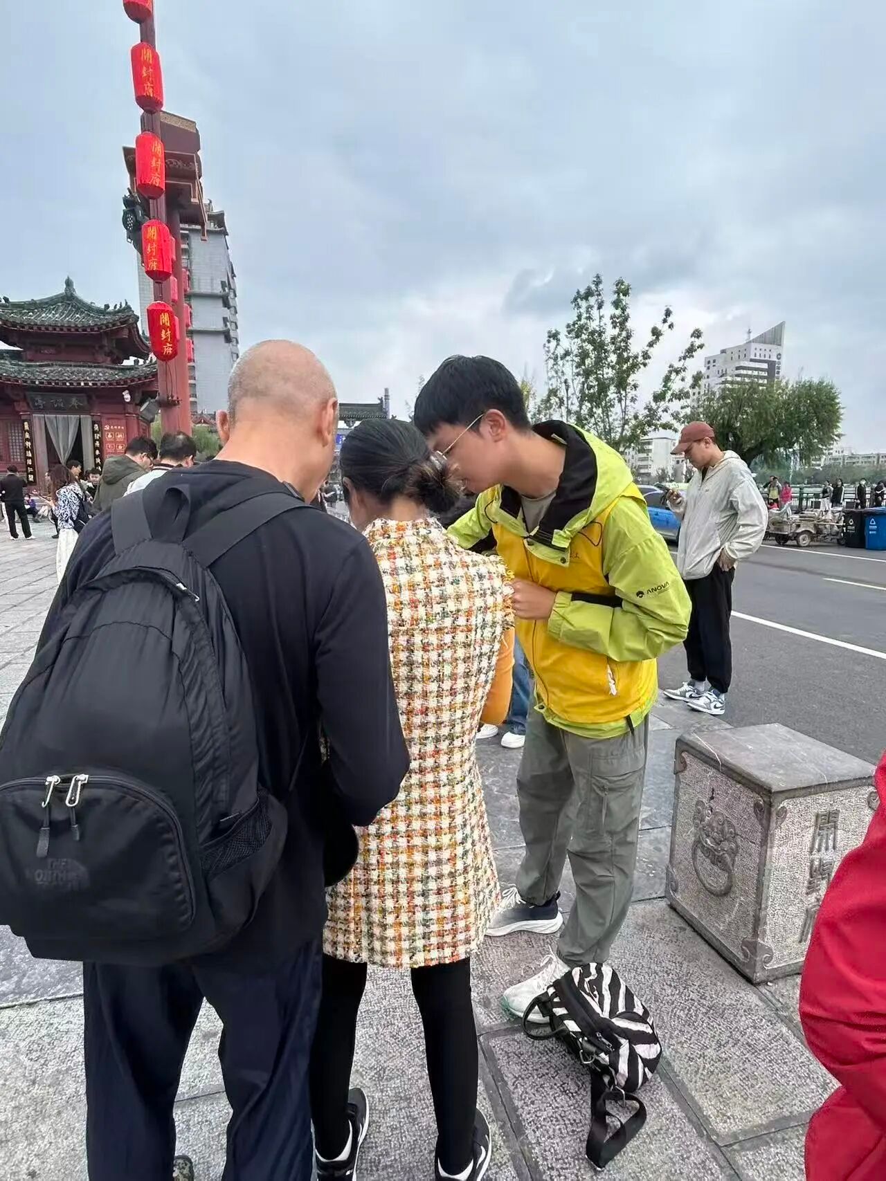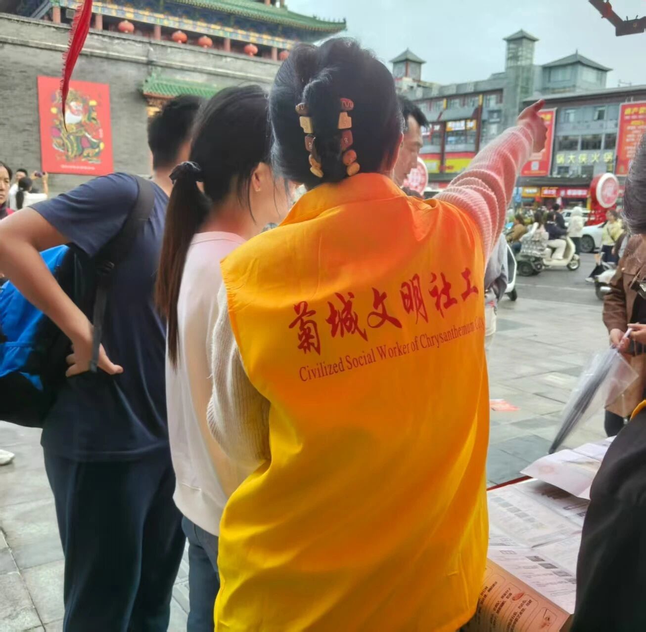 鼓楼广场的志愿者们化身“活地图”与“美食向导”,面对游客的高频咨询总能对答如流。他们不仅能精准指引前往清明上河园、龙亭公园的公交与骑行路线,手把手教老年人使用支付宝“出行”扫码乘车,还能细致推荐老五炒凉粉、王记杏仁茶、第一楼灌汤包等地道小吃,并附上避开排队高峰的实用攻略。服务点内,热水、休息凳、行李寄存架随时待命;广场上,志愿者们冒雨协助交警疏导人流,雨水打湿了红马甲,笑容却依旧灿烂。