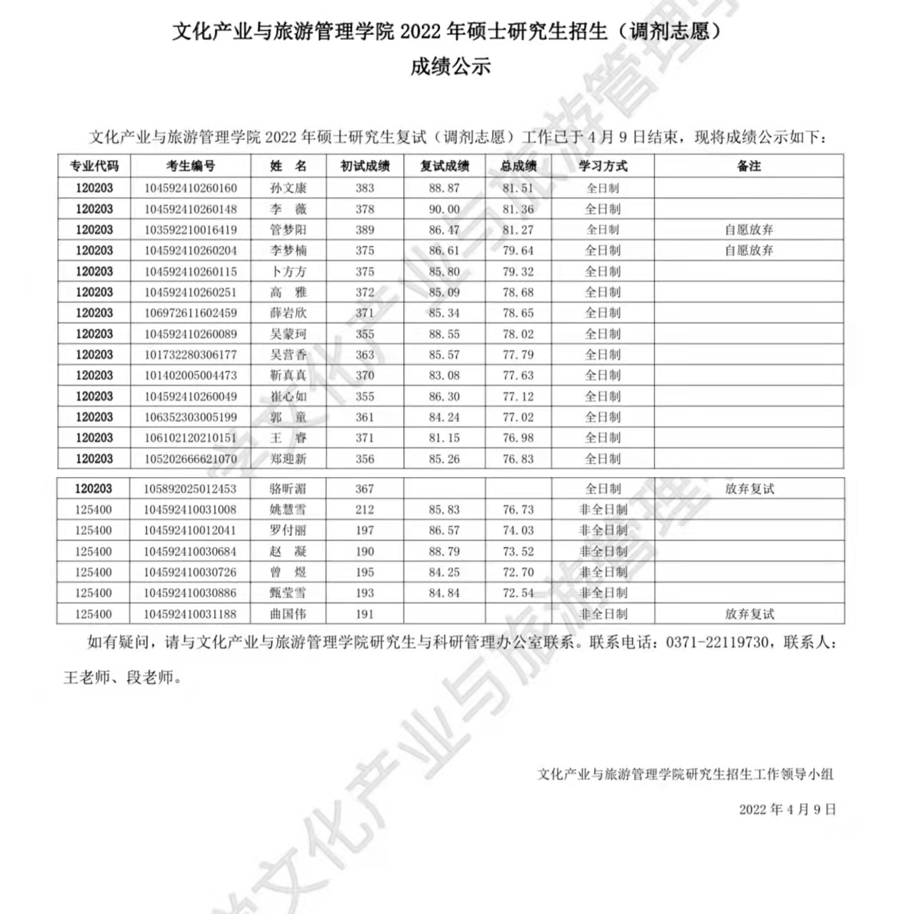 上一条:文化产业与旅游管理公司2022年硕士研究生招生(调剂志愿)成绩公示 下一条:文化产业与旅游管理公司2022年硕士研究生招生(一志愿)成绩公示