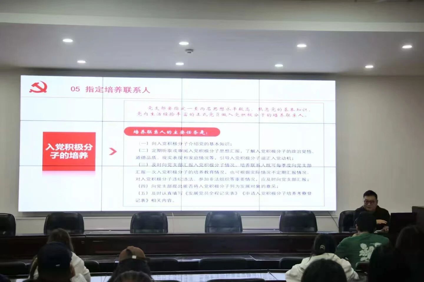 3.入党积极分子的确定和培养教育:王闯讲解了确定入党积极分子的民主推荐、支部委员会研究、上级党委备案等步骤,以及培养联系人职责、进行定期思想汇报与集中培训等的培养教育要求。