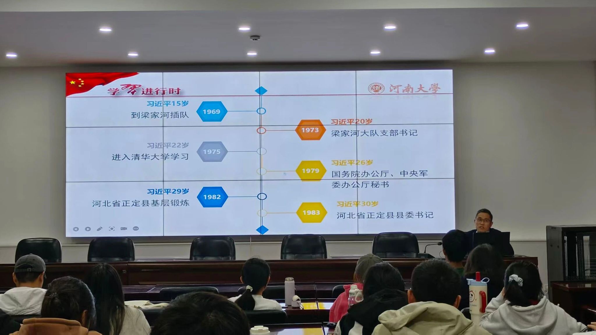 在价值观塑造的具体路径讲解中,刘英钦以青年习近平的成长历程为核心典范,带领同学们深入学习《习近平的七年知青岁月》所传递的精神力量。他详细梳理了青年习近平的成长轨迹:15岁到陕北插队,在艰苦的农村环境中磨砺意志;20岁当选大队党支部书记,在服务群众中积累经验;22岁考入清华大学,在知识殿堂中汲取养分;26岁进入国务院工作,在实践中锤炼能力。这一段段扎根基层、追求进步的经历,为在场学子树立了“在奋斗中成长、在奉献中升华”的鲜活榜样。