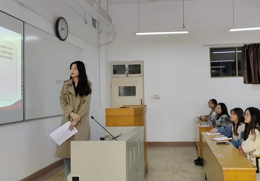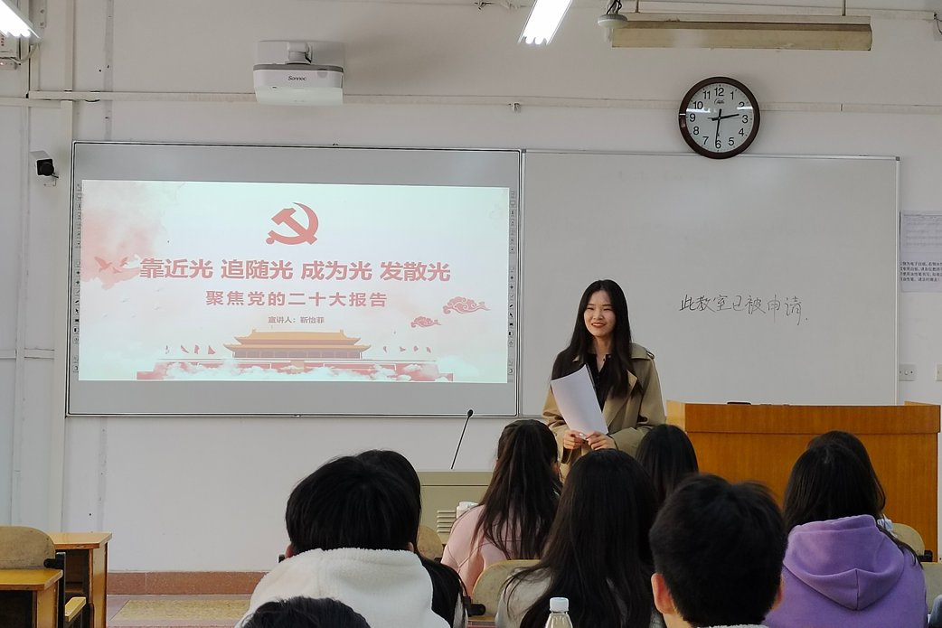 3月2日下午,靳怡菲面向旅游管理类2201团支部与旅游管理2102团支部做了主题为“靠近光 追随光 成为光 发散光——争做一名优秀的新时代老员工党员”的宣讲。