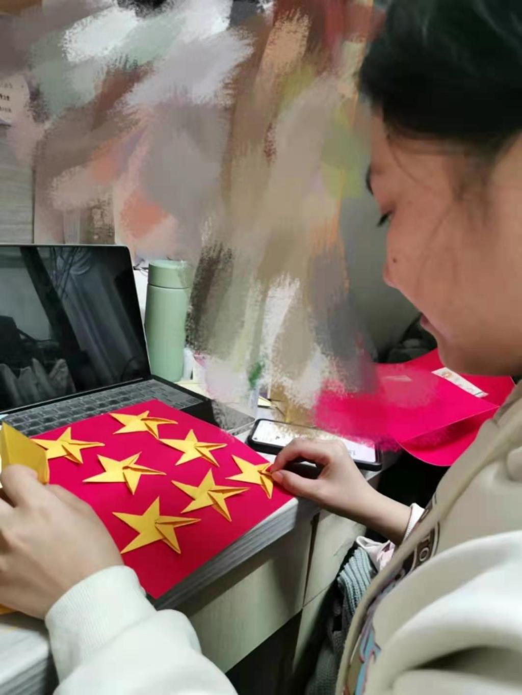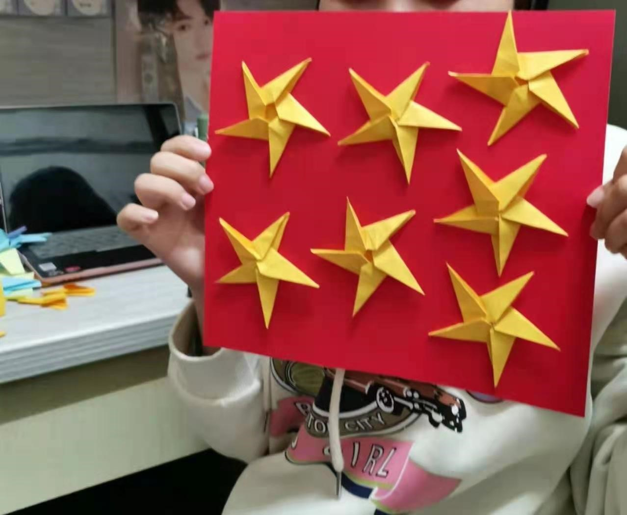 “灵感来源于‘聚是一团火,散是满天星’,代表着中国共产主义共青团的团员们如同散布漫天的星星,可能有时不那么起眼,但是需要大家的时候,汇聚在一起就能变成熊熊烈火,照亮前进的路。虽然这个作品看着十分简陋,但却是‘手工课不及格’的我尽力的结果,先是学习做五角星便观看了许多教程视频,学了好几种折法,用了二十几张纸,才做出来些看得过去的星星。作品的完成实在崎岖坎坷,幸好最后做出来还算可以。建团百年正青春,奋斗有为正当时!”