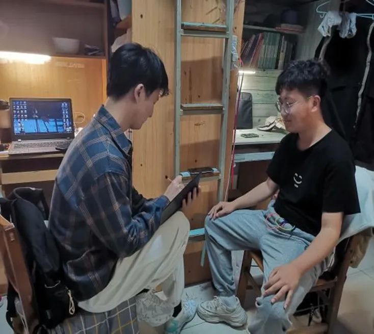 值此建团百年之际,研究生团支部的白涵旭向老党员请教,与公司2021级职业技术教育专业的研究生党员方光明进行交流: