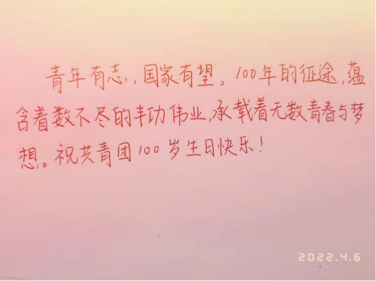 旅游管理类2103团支部胡桂鑫手写了对共青团的祝福,并在此过程中留下了深刻的感悟:“陈独秀先生曾说过:“青年知初春,如朝日,如百卉之萌动,如利刃之新发于硎,人生最可宝贵之时期也。青年之于社会,犹新鲜活泼之在人身。”人生因为梦想而高飞,人性因为梦想而伟大。今日,习近平总书记明确提出“中国梦",它生动形象地描绘了全体人民的共同理想,凝聚了几代中国人的夙愿,体现了中华民族和中国人民的整体利益,成为海内外中华儿女的公约数和共识,成为激励全体人民团结奋进的精神旗帜和高昂旋律。让共青团的旗帜引导我们前进, 让党的阳光哺育我们成长, 我们团结在共青团的旗帜下, 迈着矫健的步伐, 共同创造新世纪,新的辉煌!”