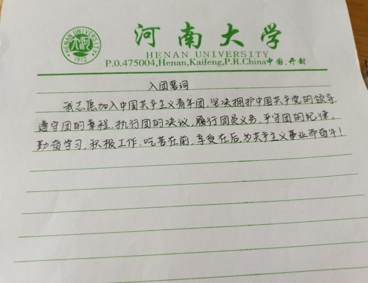 旅游管理2001团支部王梦苒重温并抄写了入团誓词,她这样写道:“通过重温和抄写入团誓词,我在一字一句中体会到了无数革命先辈们在为了祖国的解放与发展建设中付出的艰辛,回忆起了入团时站在团旗下宣誓时的神圣感,明确了共青团员的责任与义务,深刻认识到了自身肩负的历史使命和担当。作为共青团员的我们,当苦练本领、脚踏实地,不负青春、不负使命,以实际行动践行入团誓言,为团徽添彩,将共青团员的先进性和光荣感充分体现出来。”