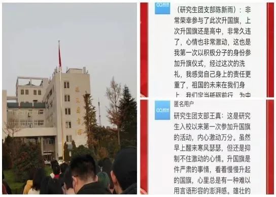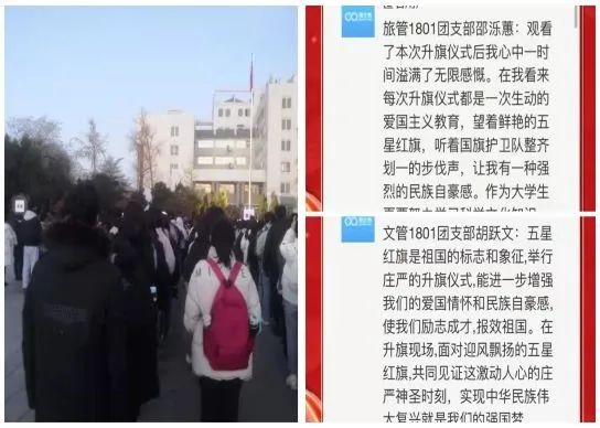 文管1801团支部成萌:随着黎明冲破黑暗,我们踏上了去往升旗仪式的路上,随着国歌慷慨激昂的响起,我们看到了鲜艳的五星红旗在飘扬,它闪耀着我们中国人坚强的意志,突出着中国青年奋发向上的精神状态,我们中国青年当如这面五星红旗,当如这黎明,破开一切阻碍,为中华民族崛起而读书!
