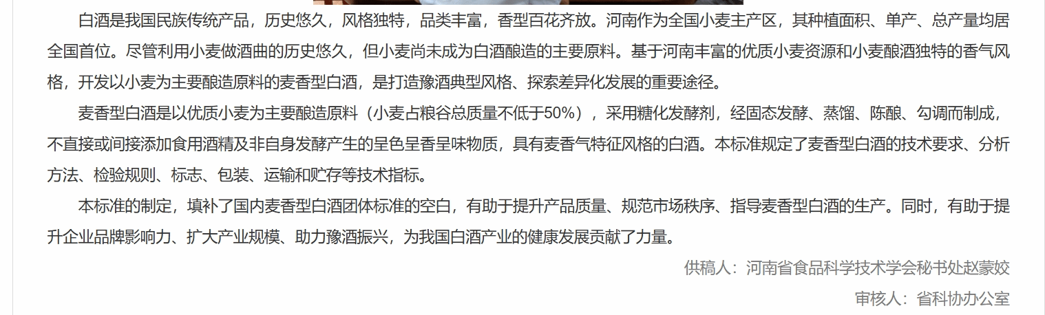 该标准的制定与发布,填补了国内麦香型白酒团体标准的空白,有助于促进河南白酒产业转型升级实现“豫酒振兴”,为河南全省农业深加工产业链的蓬勃发展和全国白酒产业的健康发展,注入了新的动能。