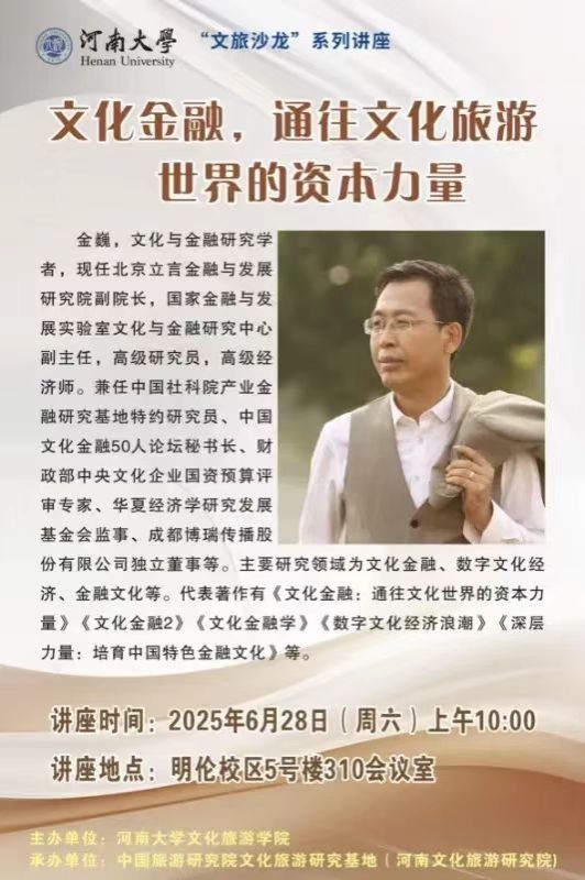 6月28日(周六)上午10:00, “文旅沙龙”系列讲座将在best365足球官网明伦校区5号楼310会议室举行。本期讲座的主题是“文化金融,通往文化旅游世界的资本力量”,主讲人为北京立言金融与发展研究院副经理,国家金融与发展实验室文化与金融研究中心副主任金巍。