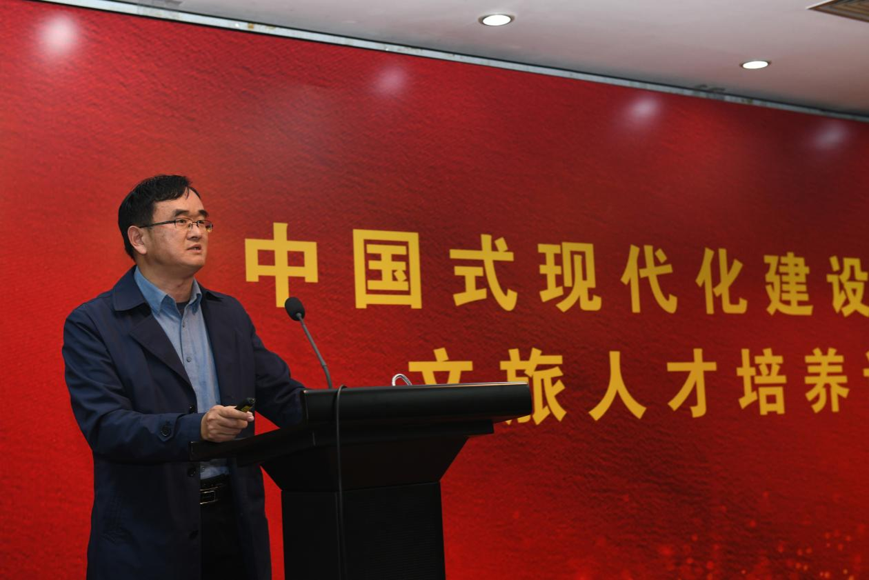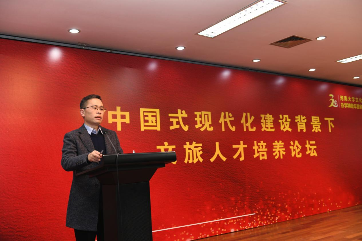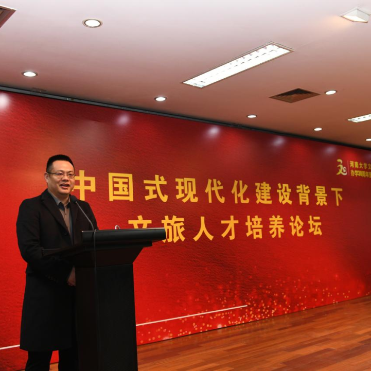 随后,在张召鹏的主持下,刘英基、赵现红、程金龙、焦士兴分别发表了主题演讲,刘英基从新文科背景下旅游学科面临的挑战和旅游人才培养数字升级两个方面阐述了他对旅游专业转型升级问题的见解,并提出了“三位一体”人才培养方案;赵现红以时代背景为切入点分析了中国旅游产业的现状并展望了旅游团队建设的未来之路;程金龙提出旅游管理专业的目标是培养适应新时代要求的应用型、复合型文科人才,他详细分析了现阶段旅游管理专业在人才培养上面临的一系列问题,并提出了人才培养的新理念、新模式、新机制;焦士兴分析了新旅游时代的发展趋势,为新时代旅游人才培养建言献策。