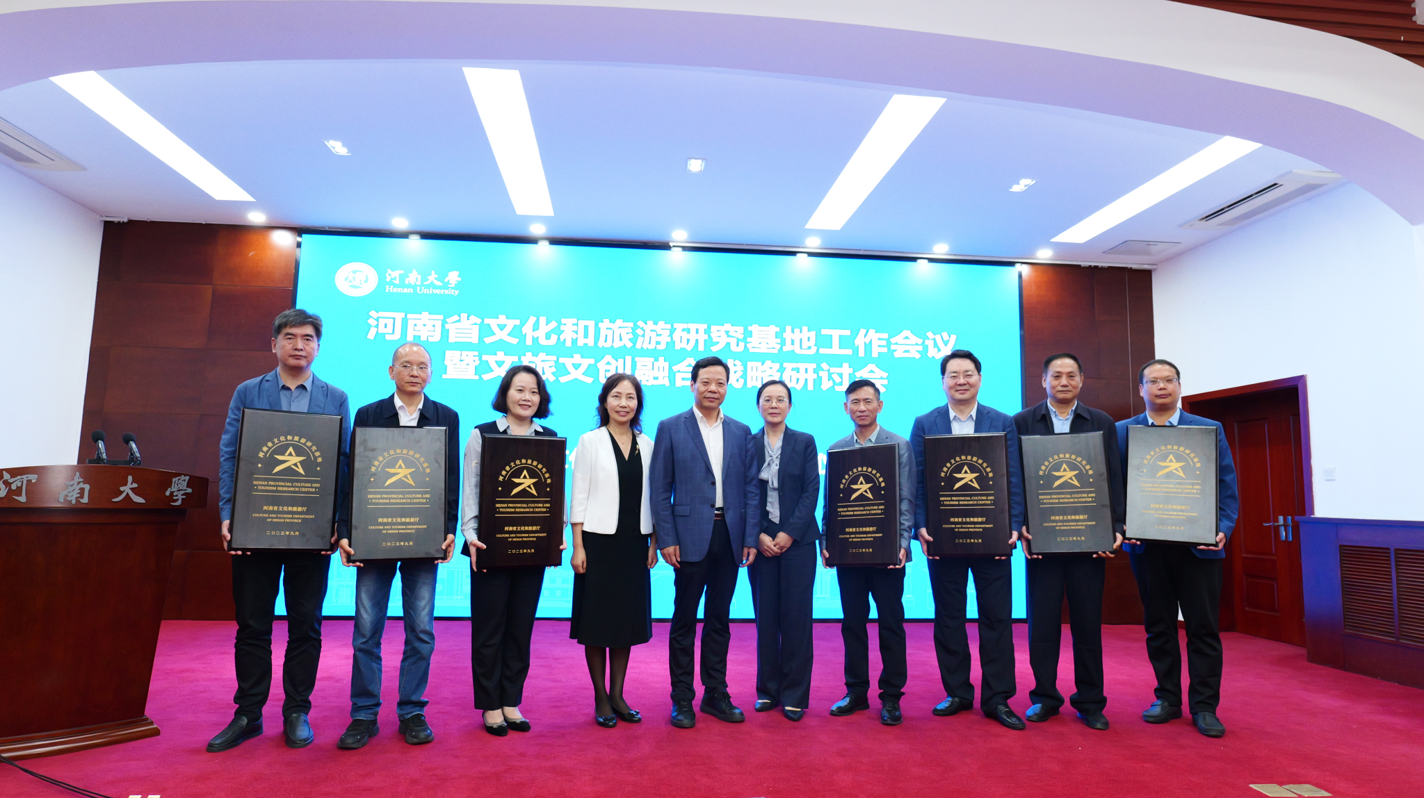 李延庆在讲话中指出,今年以来,河南文旅喜事连连,举办了一件件重大活动,国内外文化和旅游业界的目光都在关注河南。文化和旅游研究基地成立于文旅消费市场快速复苏、文旅发展动能强劲反弹的关键其实,恰是正逢其时,也应大有作为!我们组建研究基地,就是为了博百家之长、研天下之道、助文旅发展。针对做好新时期文化和旅游研究基地工作,他提出了“三个聚焦”:一是聚焦构筑立足河南、面向全国的文化和旅游研究高地,二是聚焦打造中华文化传承创新中心、世界文化旅游胜地,三是聚焦实施文旅文创融合战略、塑造“行走河南·读懂中国”品牌。在全场的热烈掌声中,李延庆为各基地授牌。