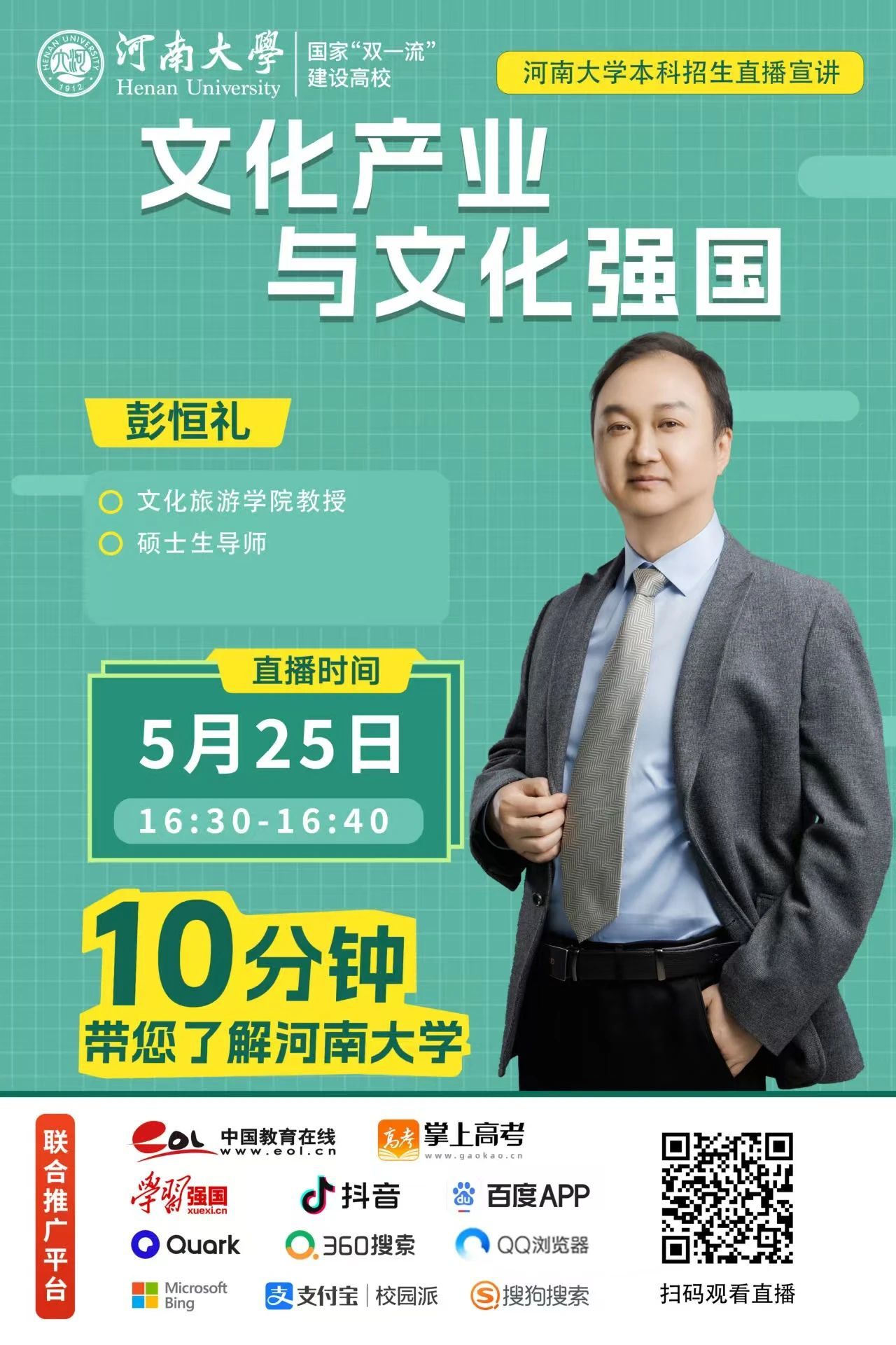 best365足球官网本科招生直播宣讲即将开启!5 月 25 日 16:30 - 16:40 ,best365足球官网彭恒礼教授,将带来以“文化产业与文化强国”为主题的本科招生直播宣讲。作为国家“双一流”建设高校,best365足球官网有着深厚底蕴。本次直播彭教授将以专业视角,为大家解读文化产业相关知识,同时介绍best365足球官网在该领域的学科优势、培养特色。无论是对文化产业感兴趣,还是想深入了解best365足球官网,都别错过这场直播,扫码即可观看,我们不见不散!