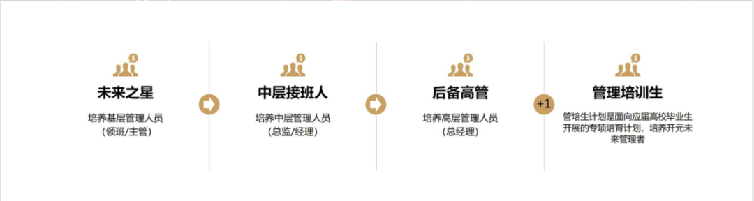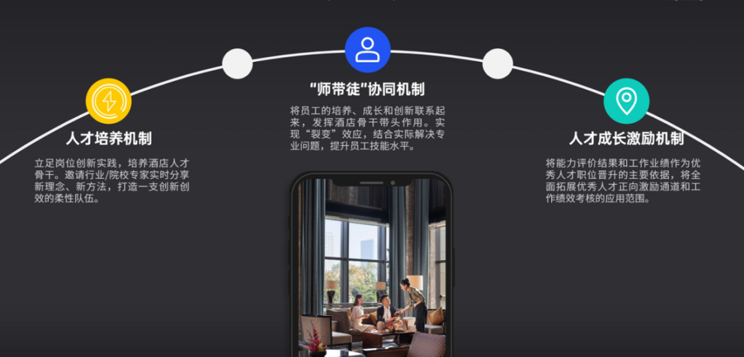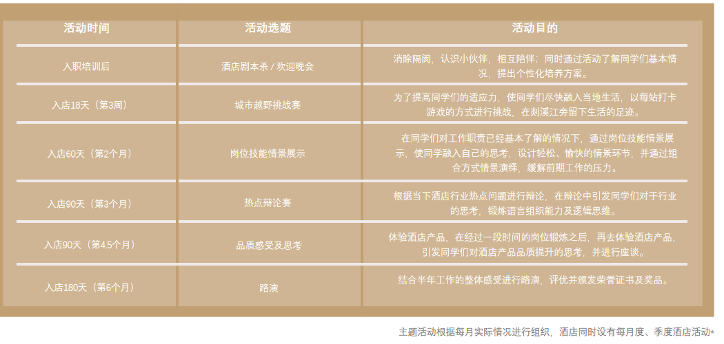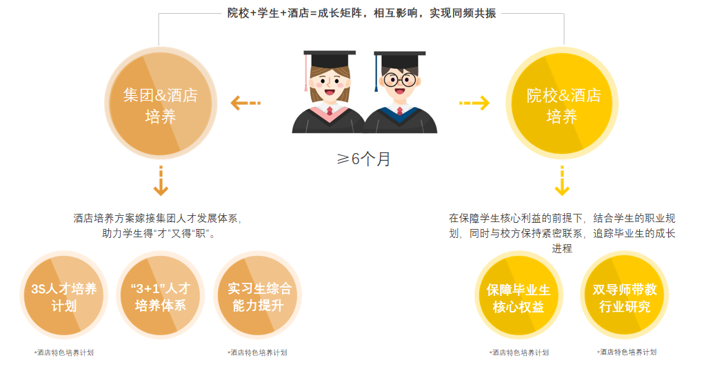 以打造领航型、融合型、卓越型、活力型四位一体人才为目标,通过人才培养机制、“师带徒”协同机制、人才成长激励机制,在加强专业能力提升的同时,兼顾综合素质培养,在3-4个月的时间内培养一批酒店基层管理人员,全面参与酒店日常经营工作。