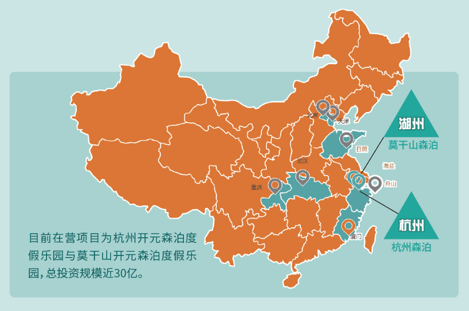 2020年12月23日,中国最大的旅游央企一中国旅游集团旗下中旅投资宣布战略投资开元森泊。目前,浙江舟山、浙江嘉兴、山东日照均有森泊项目在建,重庆、天津、四川成都、福建厦门、湖北武汉、江苏南京、云南玉溪、江西南昌、辽宁大连等项目也在有序推进中。