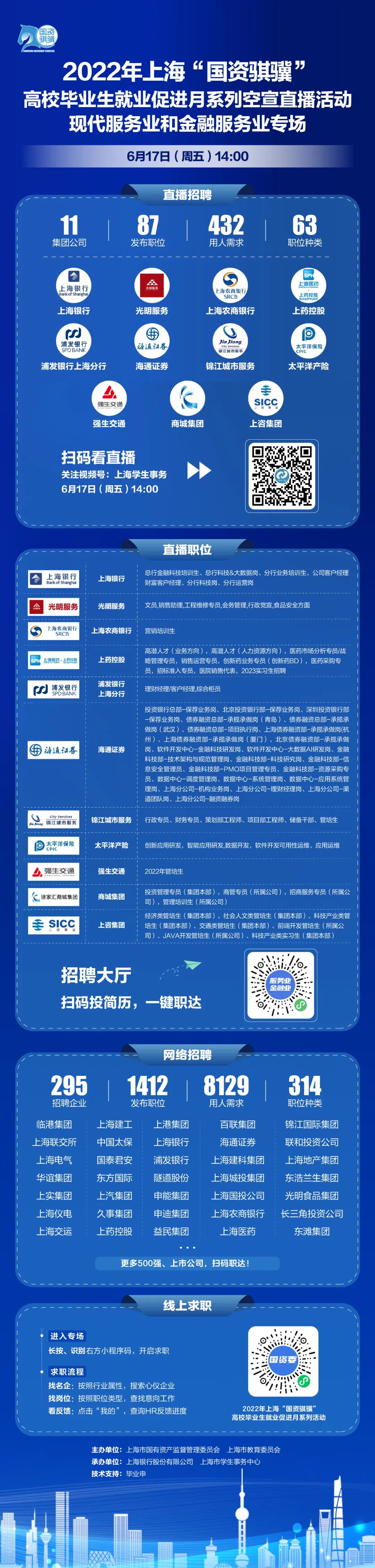 为贯彻落实党中央、国务院“稳就业”“保就业”决策部署,积极响应上海市人才办“海聚英才”云选会系列活动,市国资委联合市教委定于6月17日下午2点举办“现代服务业和金融服务业专场”空宣直播,11家企业参与,发布职位87个,计划招聘432人。